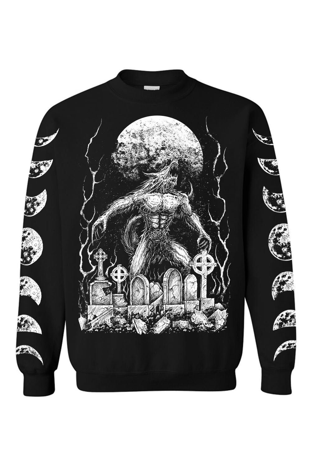 Bark at the moon in this wicked werewolf sweatshirt! Bare your fangs at the world in the cozy cotton blend, sinfully soft and comfy. Features a ferocious wolfman stalking a cemetery of crumbling graves. A full moon rises in the night sky—distressed moon phases haunt the sleeves. Perfect for Lycans, night walkers, and those who dwell in shadow.