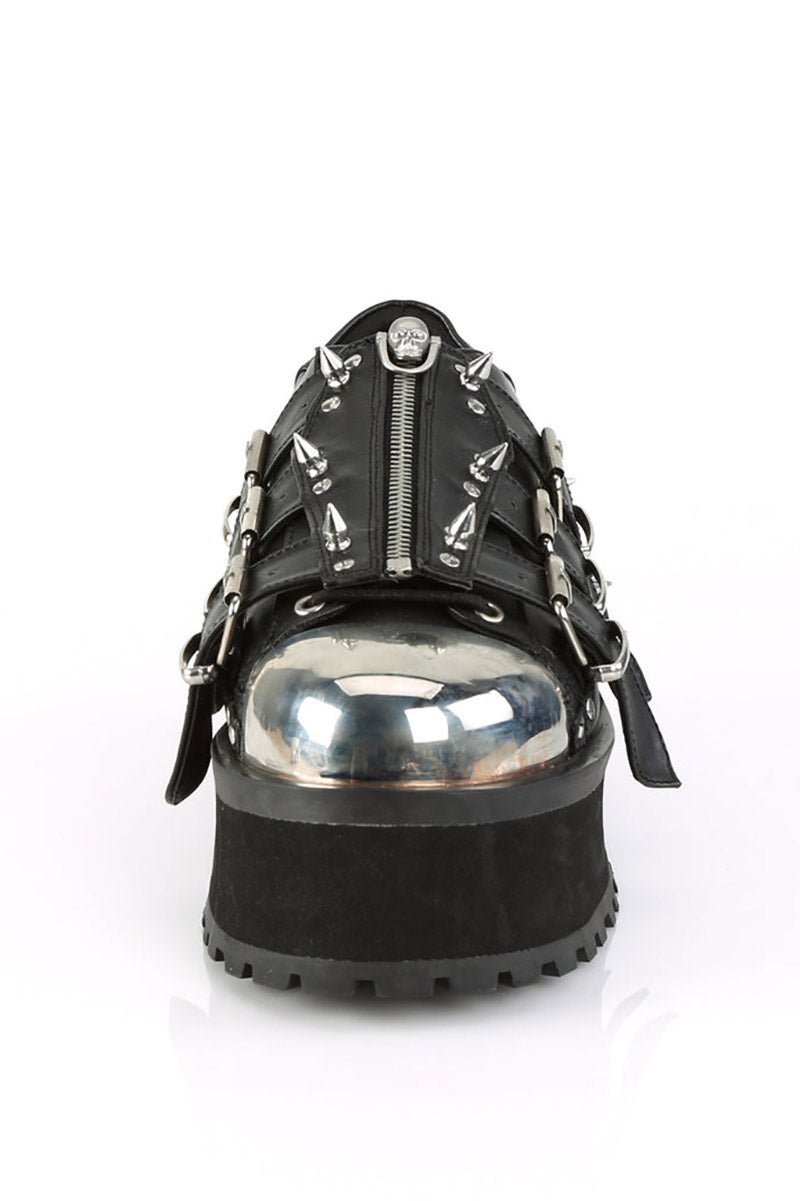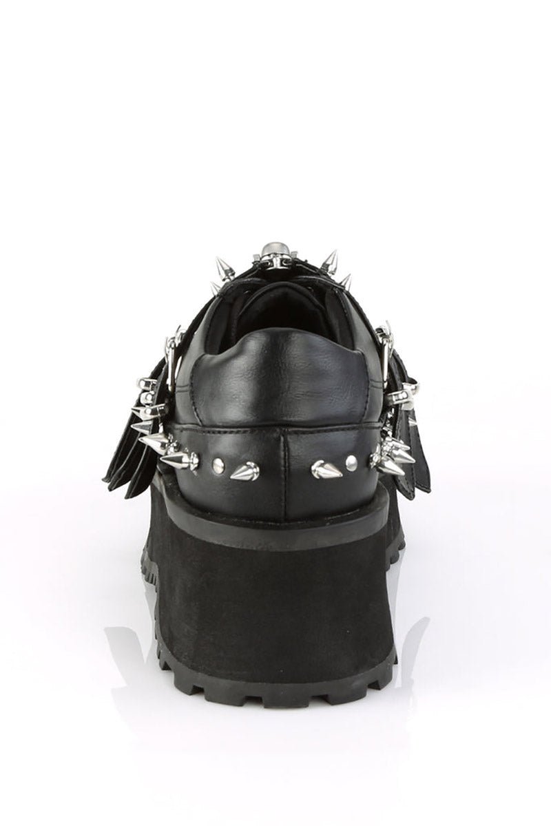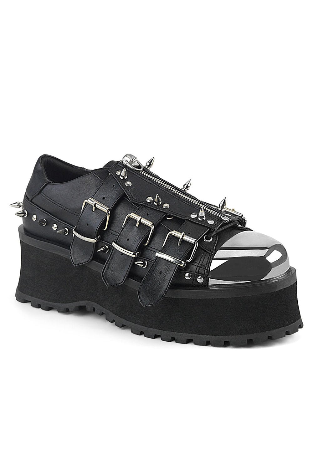 Lead the legions into the night in these deadly Demonia boots! Silver studs and spikes pierce the black vegan leather—a coffin element hexes the top. Crush the bones of your enemies in the chrome-plated toe cap and skull zipper pull. Finished with a 2 3/4″ platform to rise above the ashes.