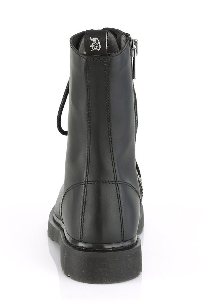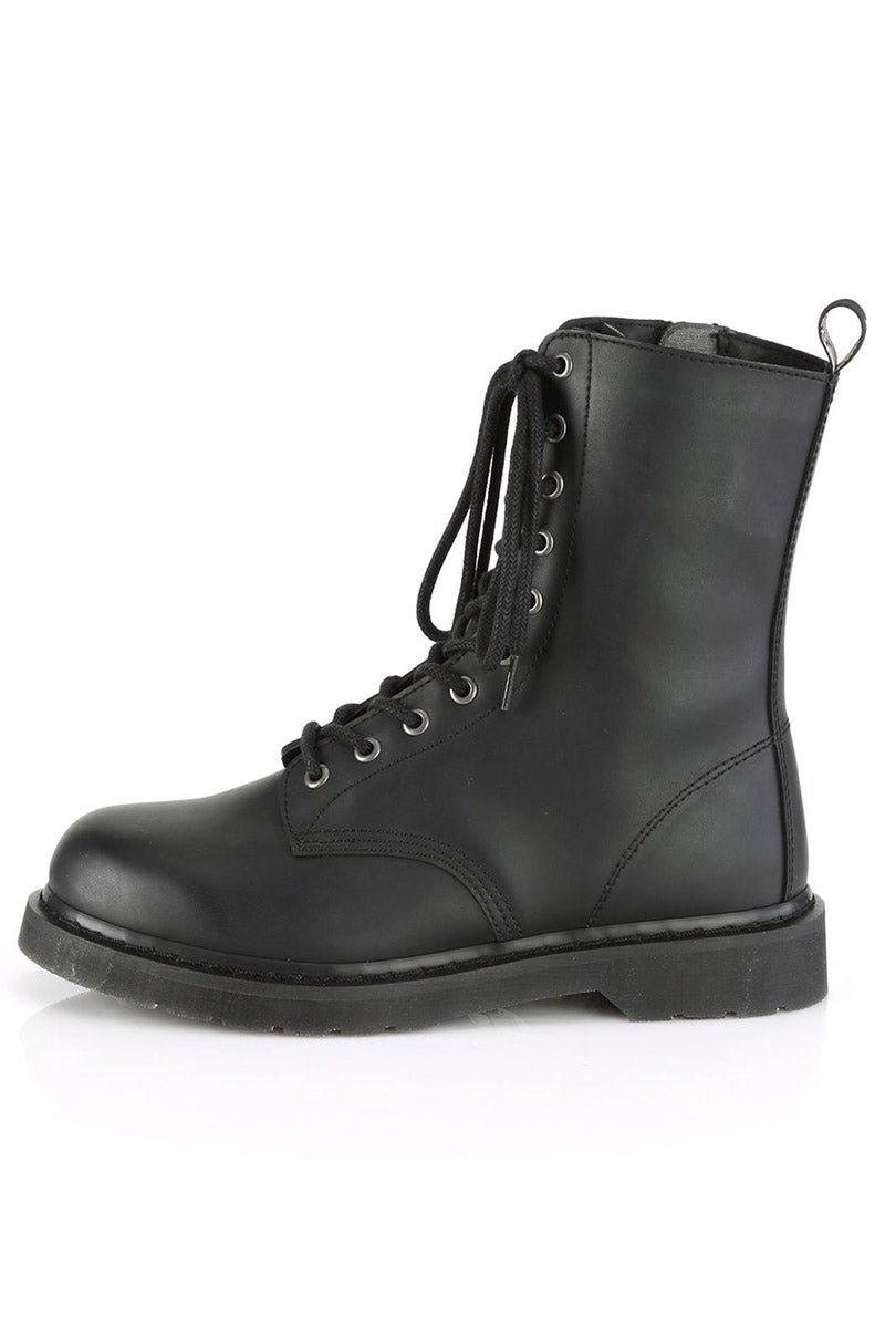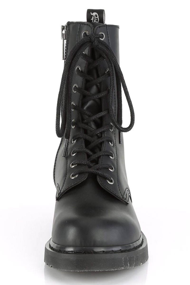 Plunge into the dead of eventide in these dark & deadly Demonia boots. Your chaos is a weapon in the black metal eyelet hardware, stacked flat heel, and back pull tab. Unleash in the mid-calf combat style, inner zip closure with lace-up details, and 1 1/4 inch platform. Constructed of quality black vegan leather cause you’ve done enough killing to last a lifetime.